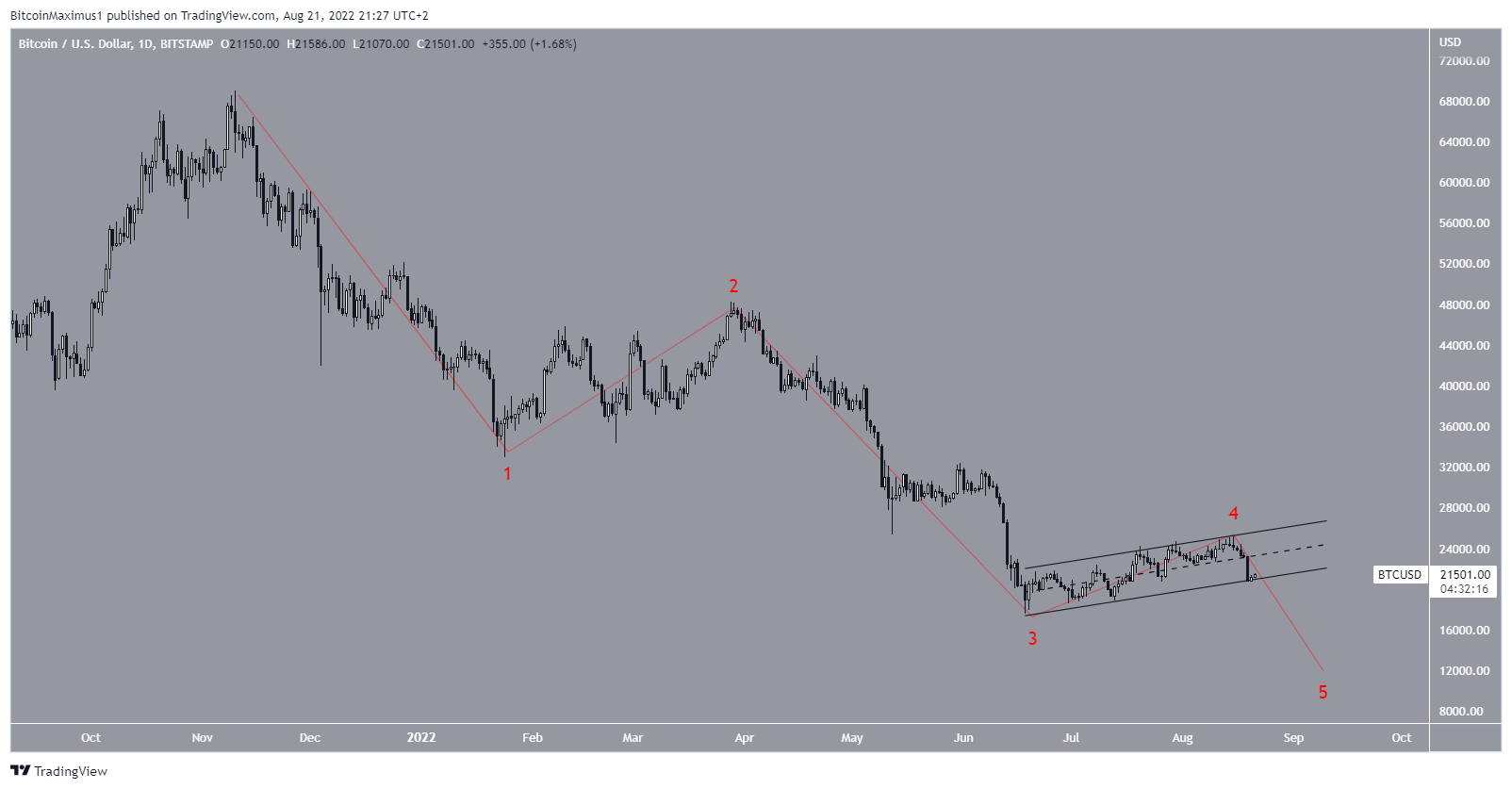 Devido à presença do canal, a contagem alternativa sugere que o Bitcoin acabou de completar a onda quatro e outra queda final seguirá antes do fundo. Até que o ativo saia do canal, essa continua sendo a contagem alternativa.