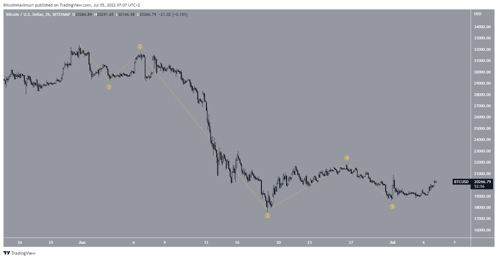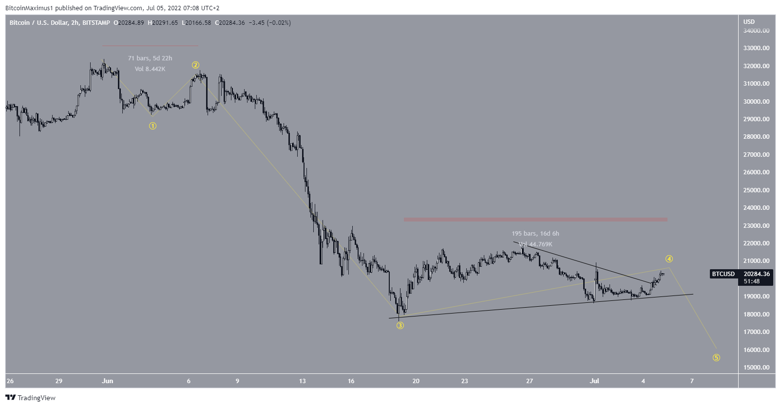 Embora inicialmente parecesse possível que o Bitcoin ainda estivesse na onda quatro, o fato de a onda quatro ter mais de três vezes o comprimento da onda dois torna isso altamente improvável.