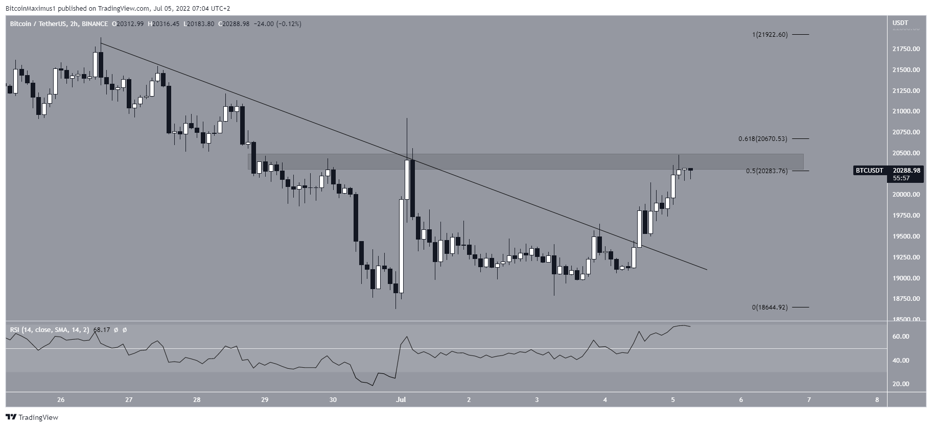 Já o gráfico de duas horas mostra que o BTC rompeu uma linha de tendência de baixa de curto prazo. Atualmente, o ativo está tentando se mover acima da área de resistência horizontal de US$ 20.400. Essa área está entre os níveis de retração de 0,5 – 0,618 de Fibonacci, aumentando ainda mais sua significância.