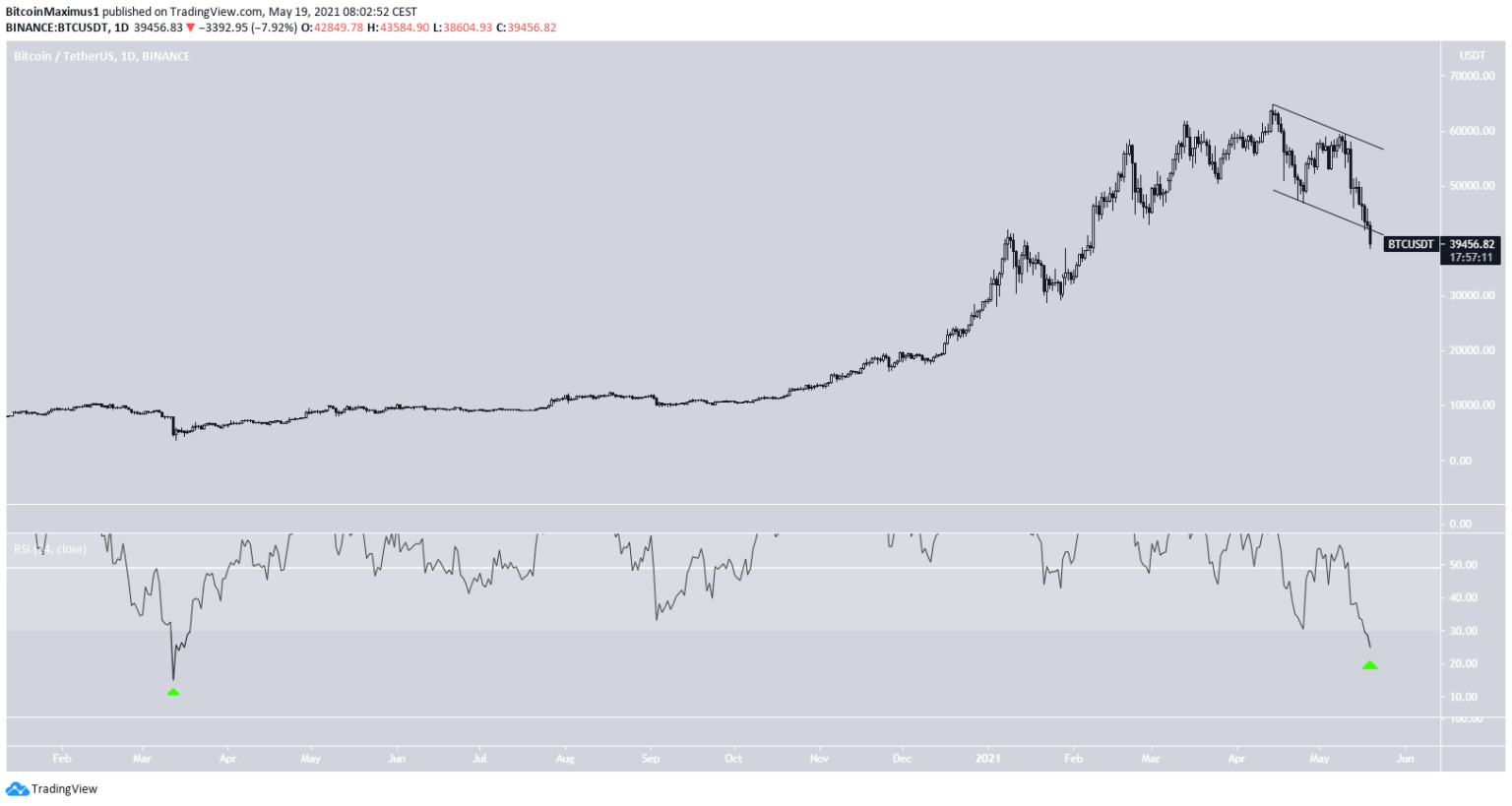 O BTC vinha sendo negociado dentro de um canal paralelo descendente desde 14 de abril. Embora inicialmente saltasse na linha de suporte deste canal, ele começou a quebrar na madrugada desta quarta-feira (19).