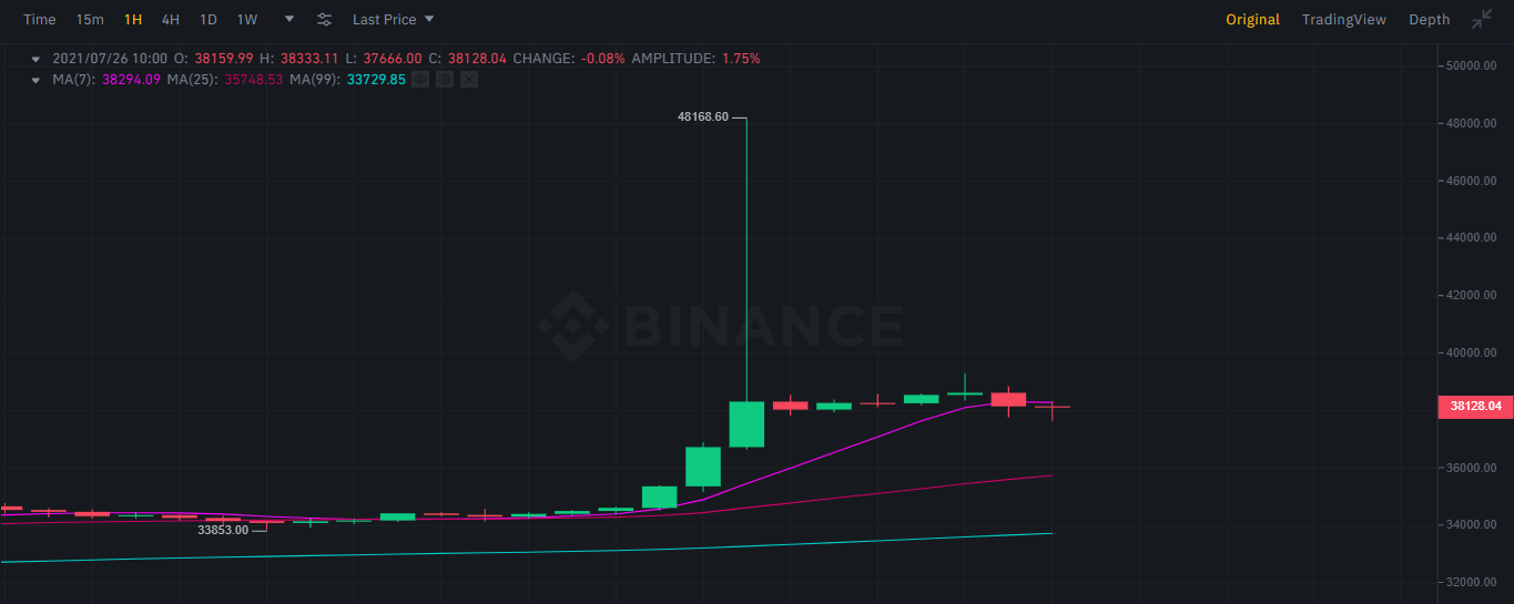 O movimento de alta mais impressionante aconteceu no mercado de futuros. Na Binance, o preço do BTC chegou a bater US$ 48.168 às 22h. Embora momentânea, a disparada de 31% foi suficiente para liquidar muitas posições vendidas, ou seja, de operações a descoberto que apostavam na queda de preço.