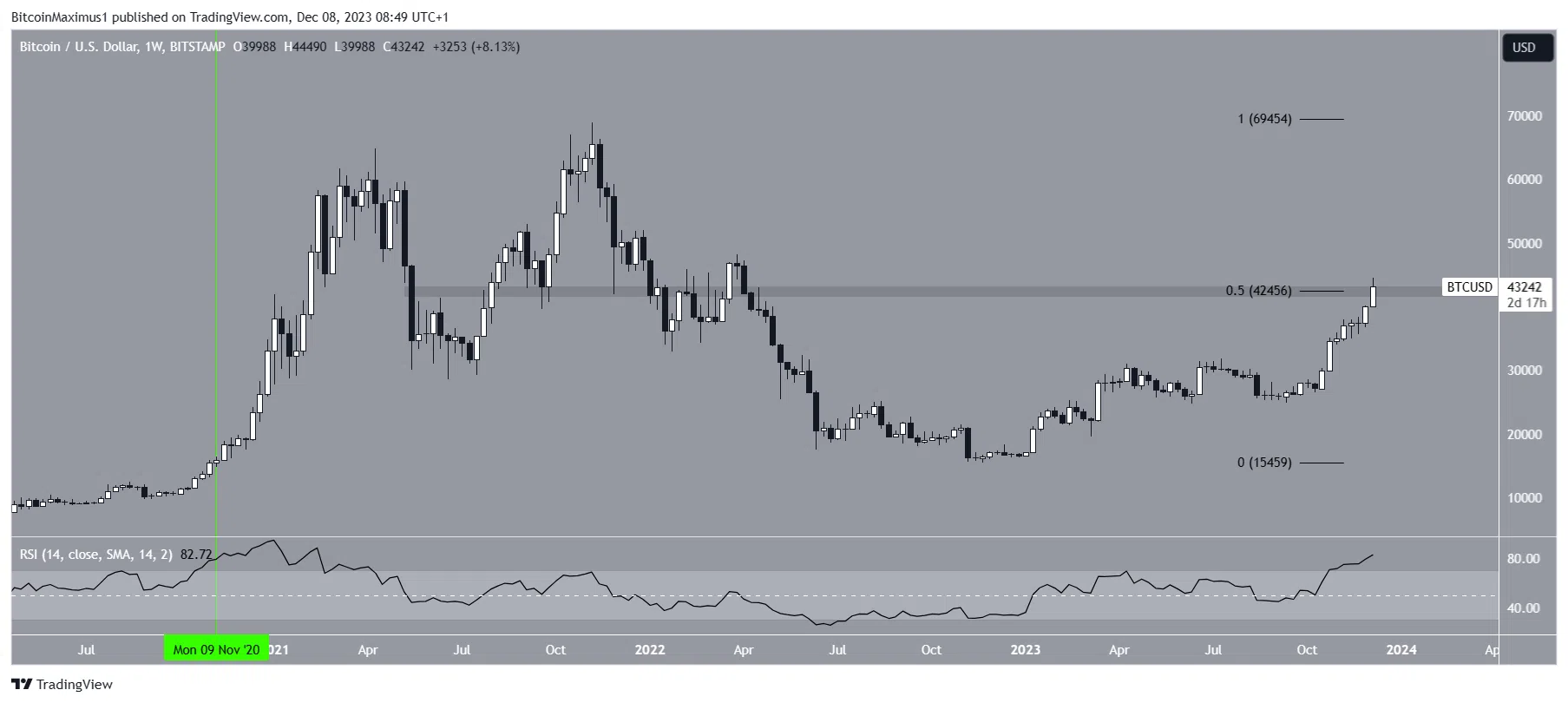 O gráfico semanal mostra que o preço do Bitcoin subiu rapidamente desde meados de outubro, criando vários candles semanais de alta.