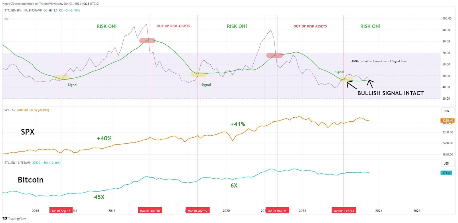 Segundo o analista, a confirmação do mercado altista e do período “risk on” foi o cruzamento ascendente da linha de sinal (verde) pelo indicador RSI mensal para o par BTC/SPX.