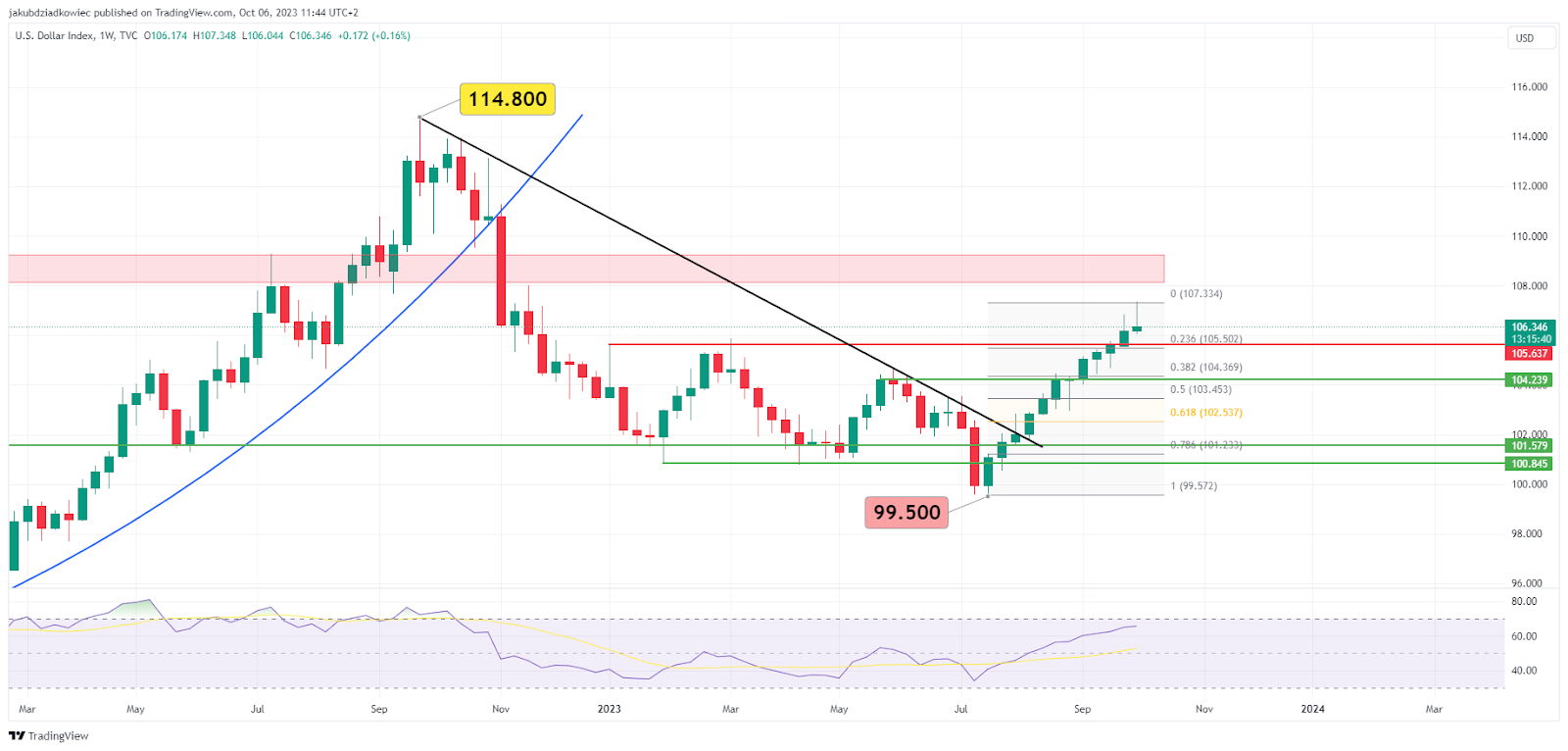 Além disso, em Agosto, o dólar rompeu a linha de resistência descendente (preta). Depois, em Setembro, rompeu uma resistência importante em 105.5 (linha vermelha). Ambos os eventos são sinais de que confirmam a tendência de alta.
