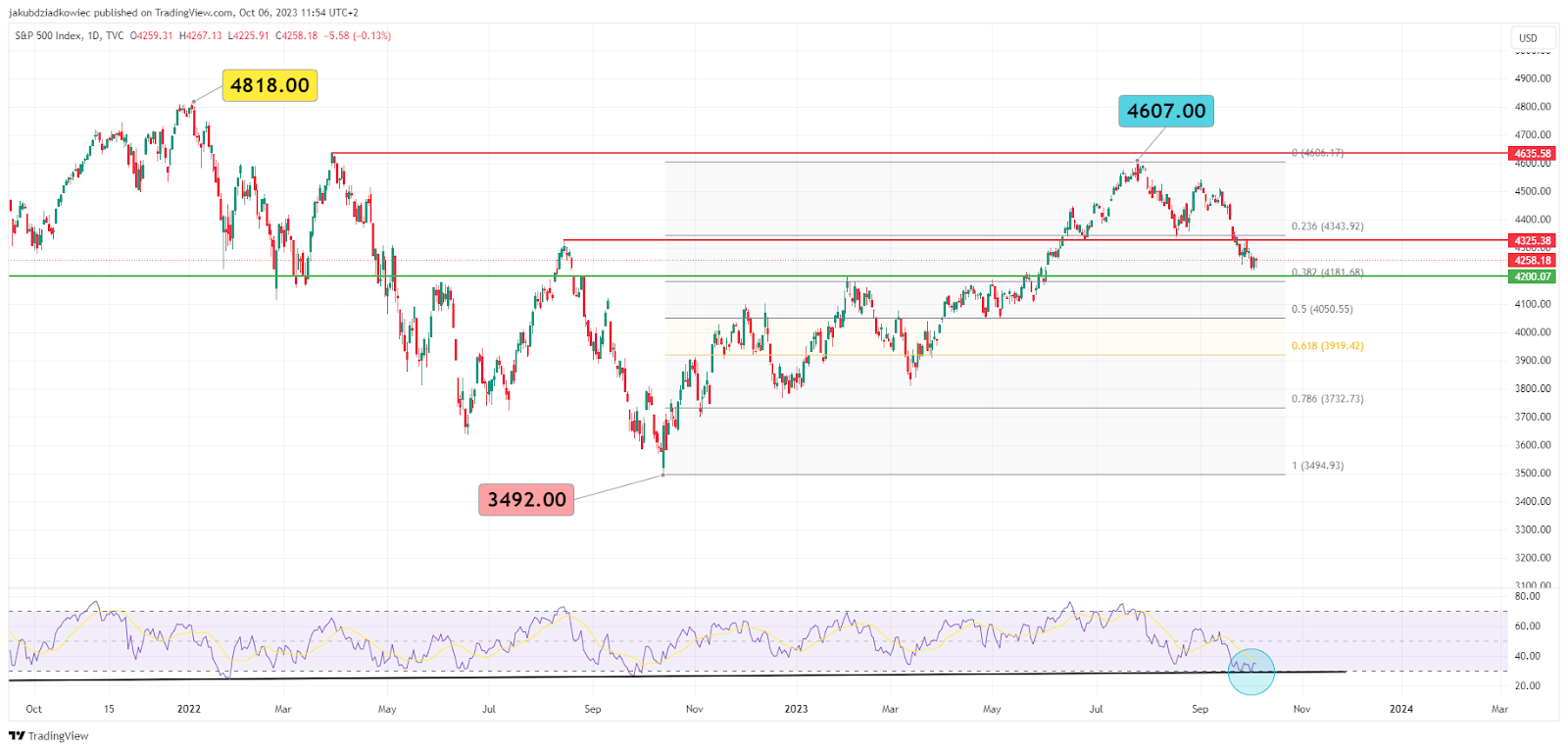 A próxima correção no DXY está em confluência com uma recuperação potencial no gráfico do S&P 500. O índice das 500 maiores empresas dos EUA, que geralmente se correlaciona negativamente com o dólar, atingiu um pico local em julho de 2023 em US$ 4.607.