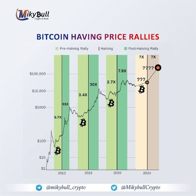 Uma adição interessante a essa perspectiva é o gráfico publicado recentemente por @MikybulCrypto, onde vemos o preço do BTC no contexto do halving subsequente. Os mercados em baixa são mostrados aqui em cinza, com aumentos relativamente pequenos antes do halving em verde claro e os maiores ralis após o halving em verde escuro.