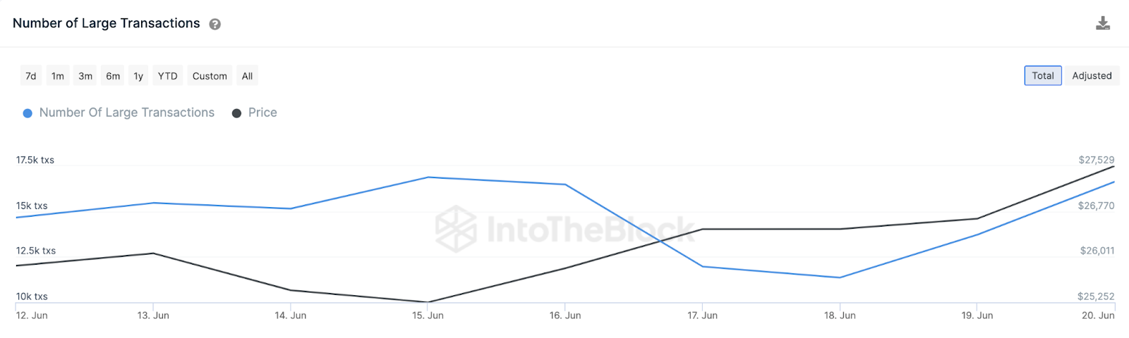 Especificamente, os dados do IntoTheBlock revelam que os Grandes Investidores aumentaram suas atividades de negociação por 3 dias consecutivos. Entre 17 de junho e o fechamento de 20 de junho, as grandes transações de BTC cresceram de 11.360 para 16.360. Isso representa um aumento impressionante de 47% em apenas três dias de negociação.