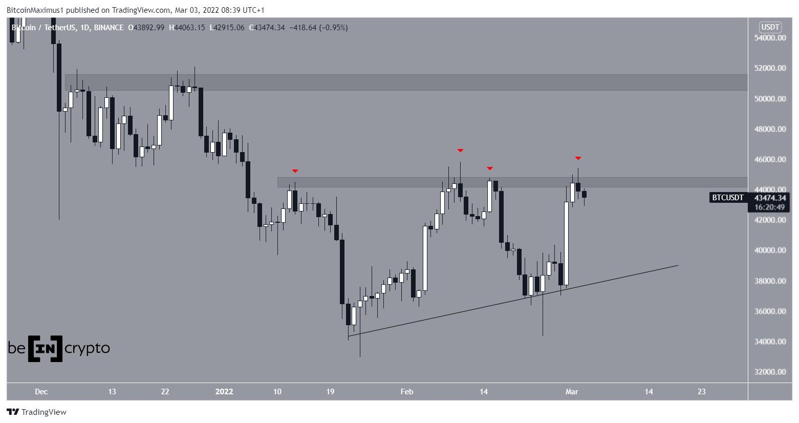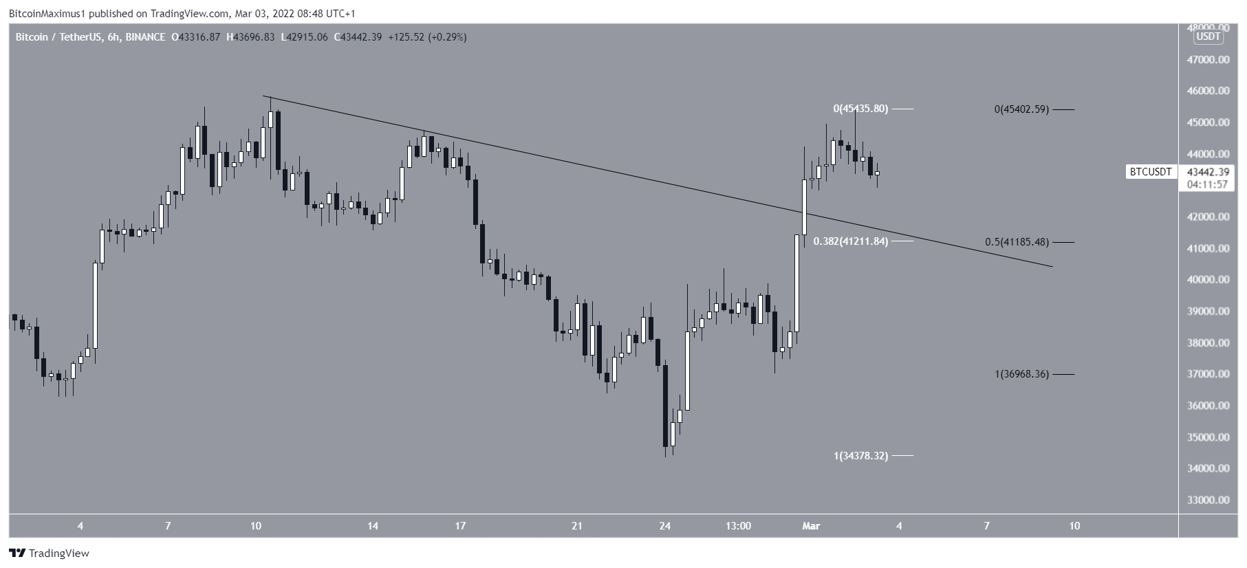O gráfico de seis horas mostra que o Bitcoin rompeu uma linha de tendência de baixa antes de atingir a alta mencionada. No entanto, ainda não superou suas máximas de fevereiro em US$ 45.821.