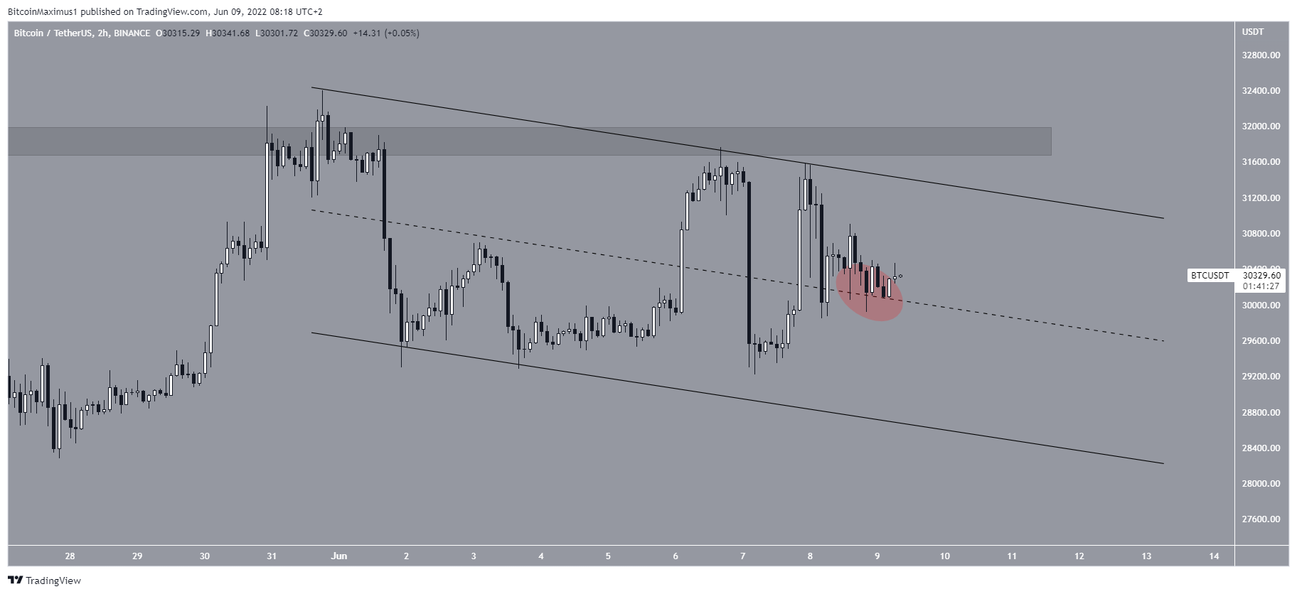 Nas últimas 24 horas, o BTC caiu (ícone vermelho) no meio do canal, na área de resistência de US$ 31.500 e na linha de tendência de baixa mencionada acima. Por sua vez, isso criou um candle de baixa. O preço agora está sendo negociado na linha de suporte do canal mais uma vez.