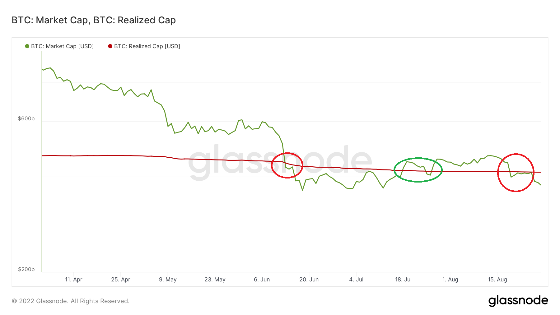 No entanto, este não foi o caso em 2022. O MC primeiro cai abaixo do RC em 18 de junho (círculo vermelho), antes de recuperar a linha exatamente um mês depois (círculo verde). Depois disso, caiu mais uma vez em 18 de agosto (círculo vermelho). Isso nunca ocorreu anteriormente no histórico de preços do Bitcoin.