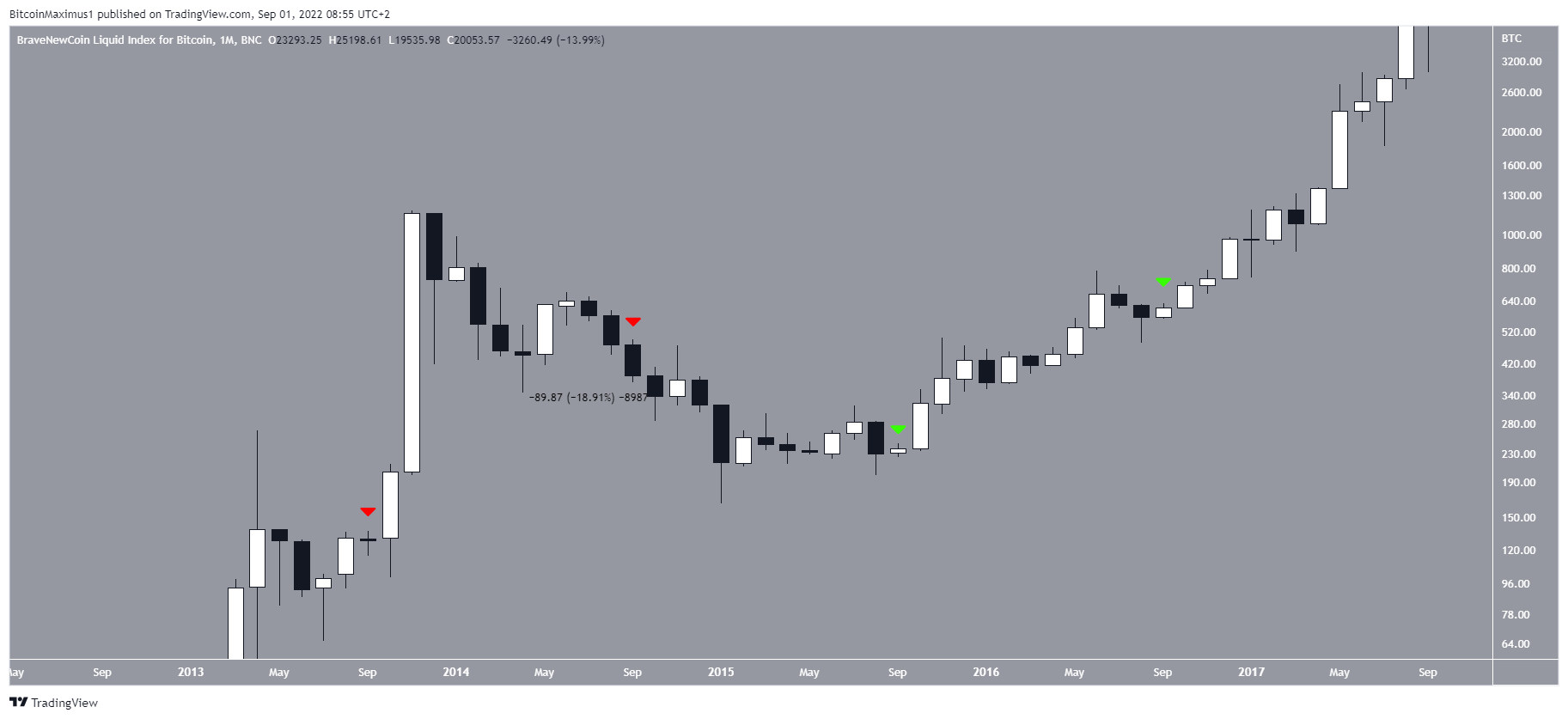 Os candles de 2017, 2018 e 2019 (ícones verdes) mostraram quedas de 8,50%, 6,75% e 14,14%, respectivamente, o que significa que os últimos cinco candles de setembro foram de baixa. Os candles de 2018 e 2019 ocorreram em tendências indeterminadas, mas o candle de 2017 foi extremamente semelhante aos de 2020 e 2021, onde foi cercada por candles de alta dentro de uma tendência de alta.