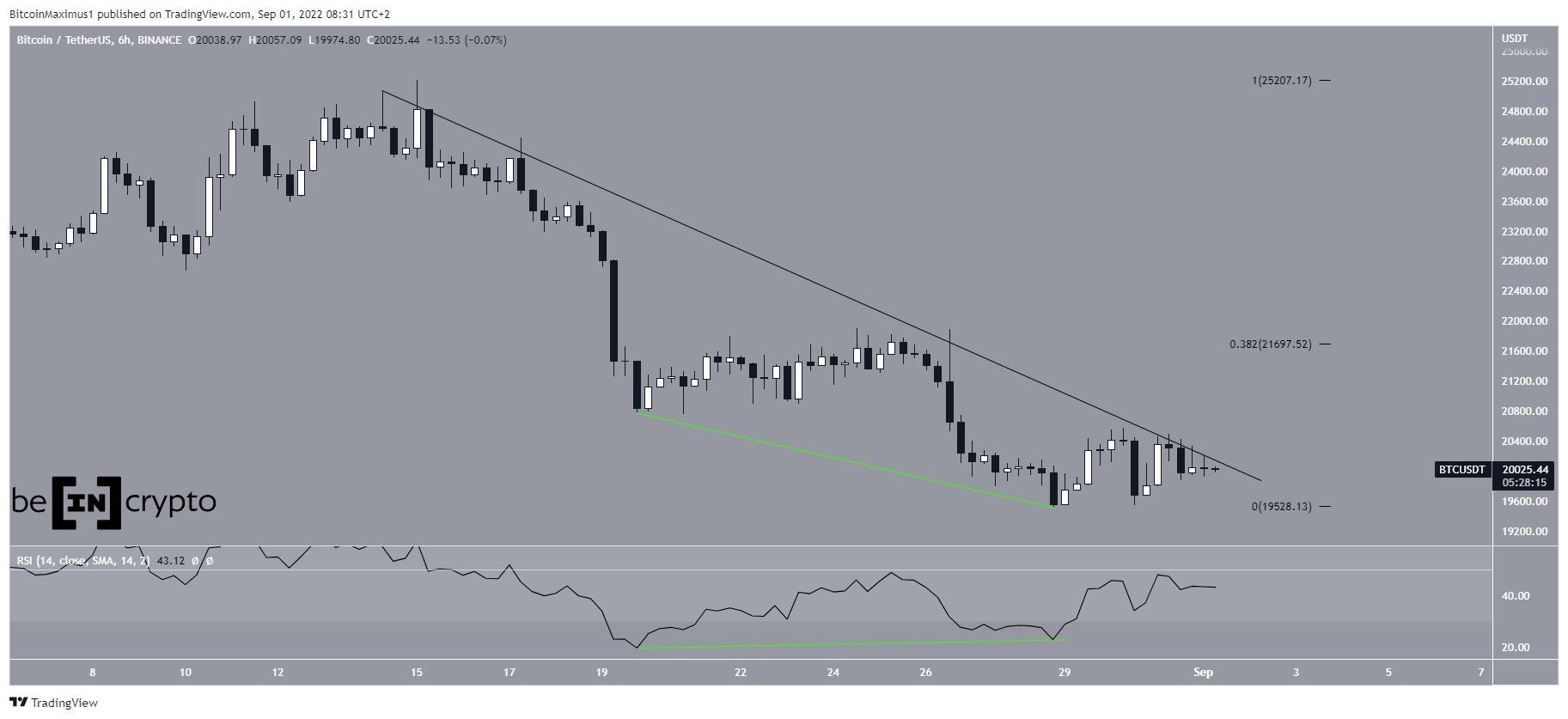 O Bitcoin vem caindo abaixo de uma linha de tendência de baixa desde que atingiu um topo local de US$ 25.211 em 15 de agosto. O movimento até agora levou a uma mínima local de US$ 19.520 feita no último domingo (28).