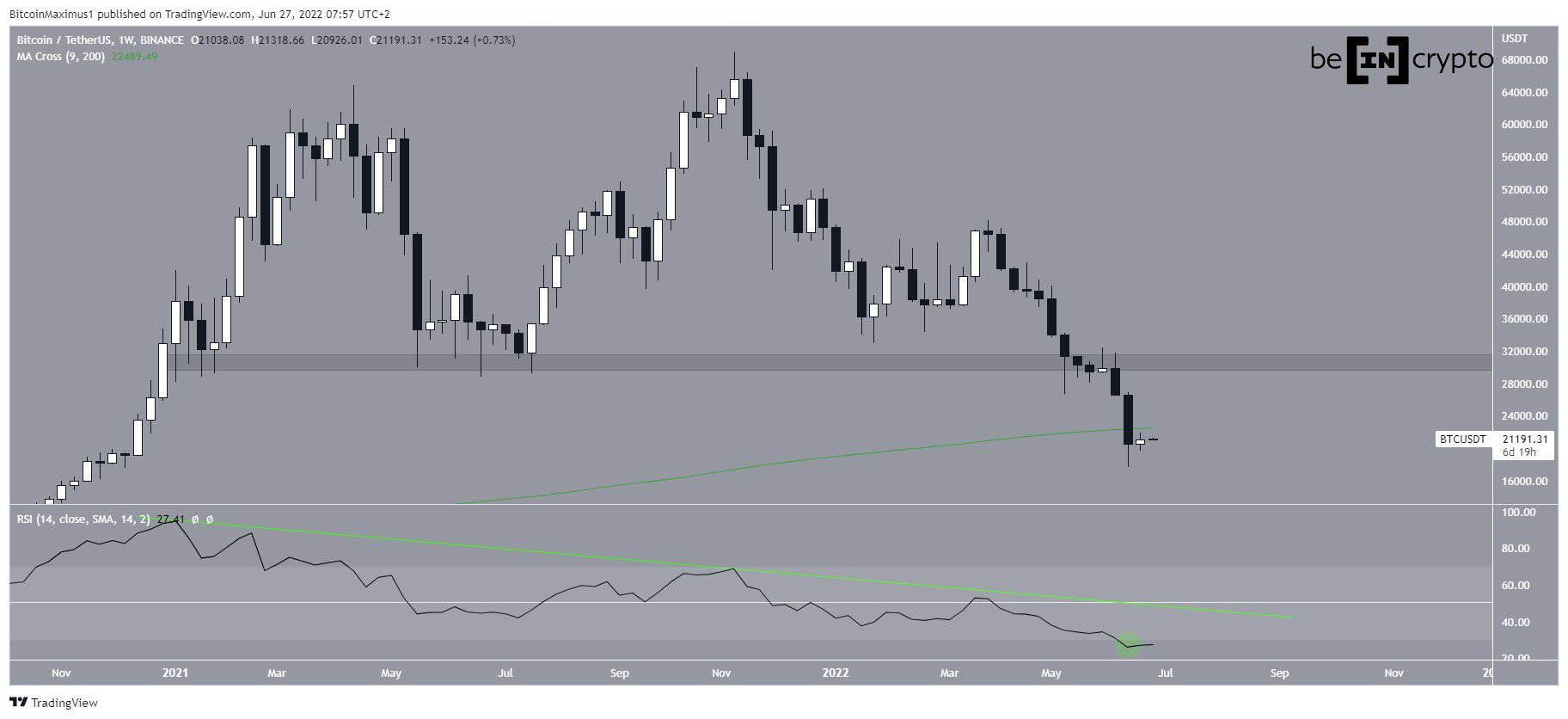 O BTC vem caindo desde que atingiu a máxima histórica de US$ 69.000 em 10 de novembro de 2021. O movimento até agora culminou em uma mínima de US$ 17.622 feita no dia 18 de junho.