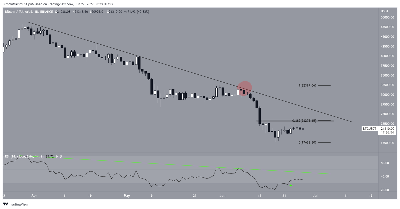 O gráfico diário mostra que o preço do Bitcoin segue uma linha de tendência de baixa desde o início de abril. Mais recentemente, a linha causou uma nova queda em 7 de junho (círculo vermelho).