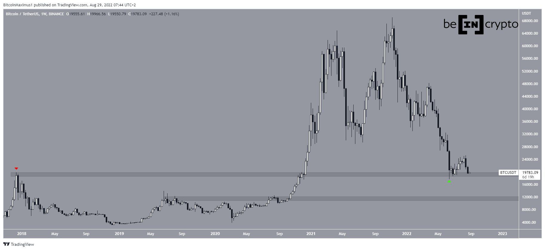 O preço do Bitcoin está em tendência de baixa desde que atingiu a máxima histórica de US$ 69.000 em novembro de 2021. Isso levou a uma mínima de US$ 17.622 feita em junho. O ativo se recuperou em seguida (ícone verde), validando a área horizontal de US$ 19.300 como suporte.