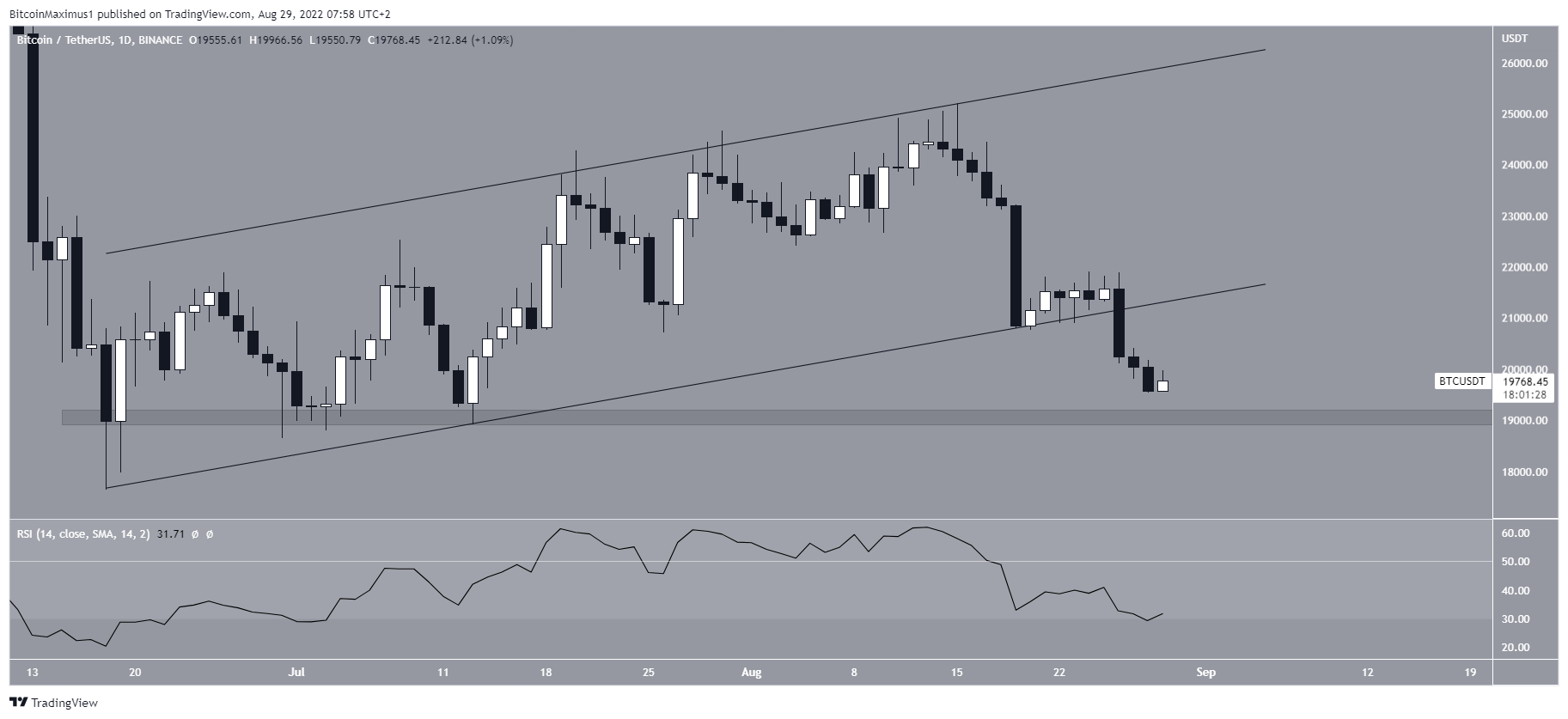 O gráfico diário mostra que o Bitcoin caiu abaixo de um canal paralelo de alta que estava em vigor desde 18 de junho. Esses canais geralmente contêm estruturas corretivas, o que significa que uma queda é o cenário mais provável. Assim, a queda atual confirma que o movimento é corretivo e novas mínimas se seguirão.