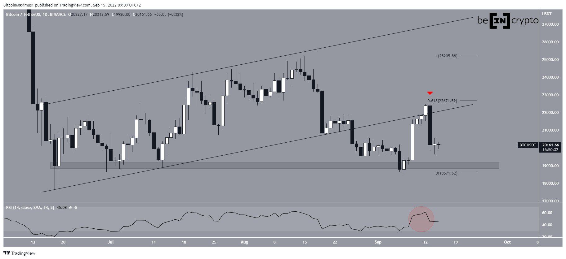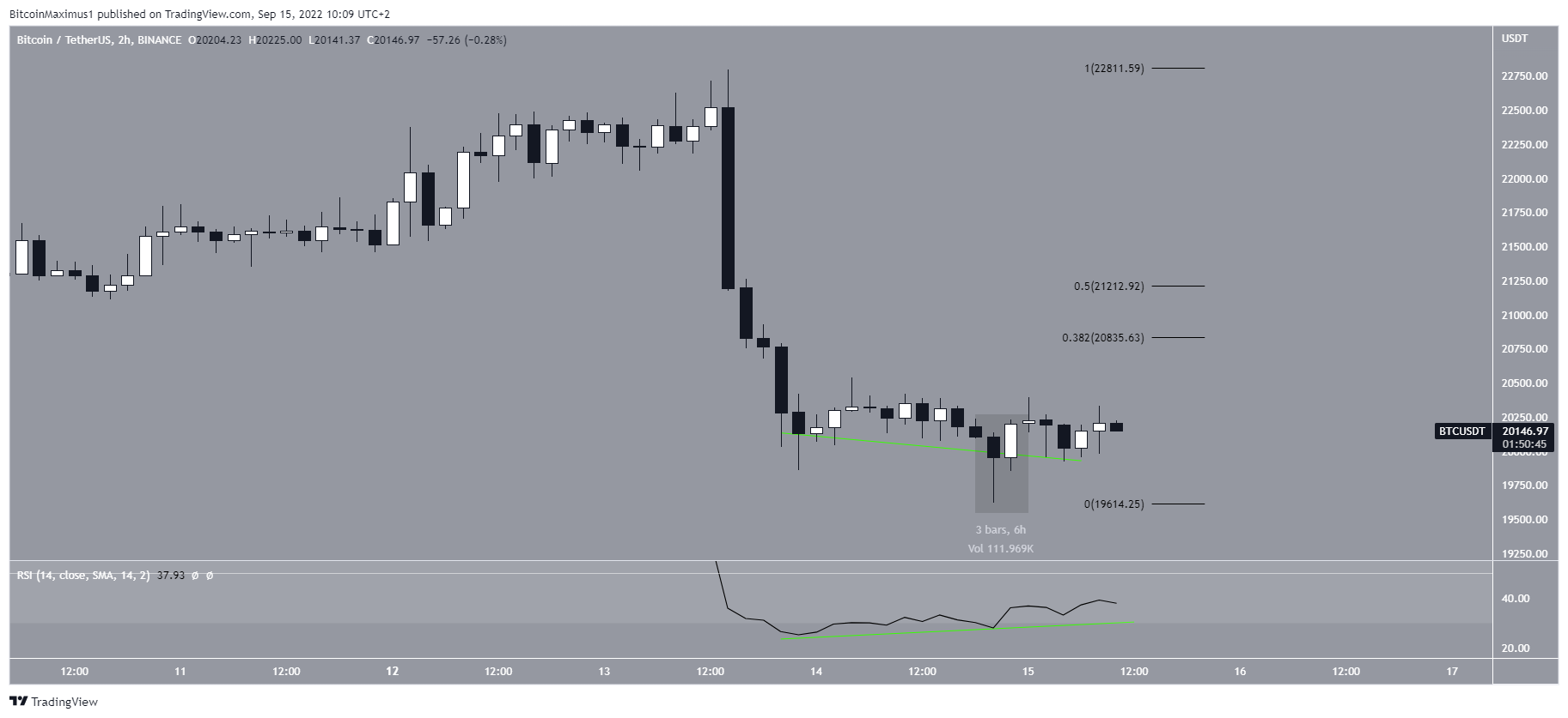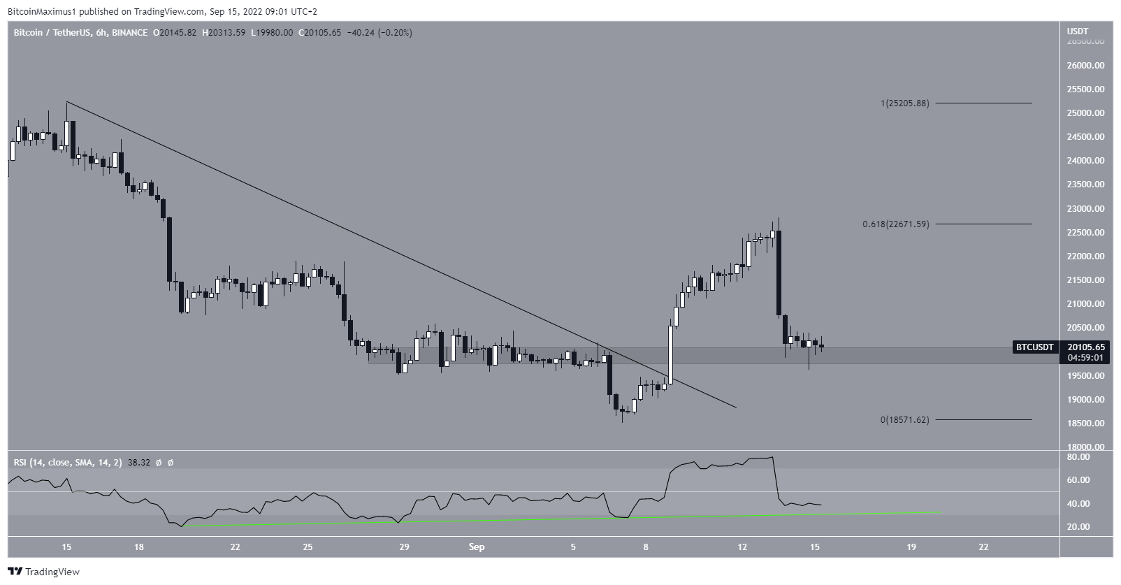 Embora o Bitcoin tenha rompido uma linha de tendência de baixa, ele não conseguiu sustentar seu movimento de alta e caiu para a área de suporte de US$ 20.000. A ligeira alta vem do fato de que a linha de divergência de alta (linha verde) no RSI ainda está intacta.