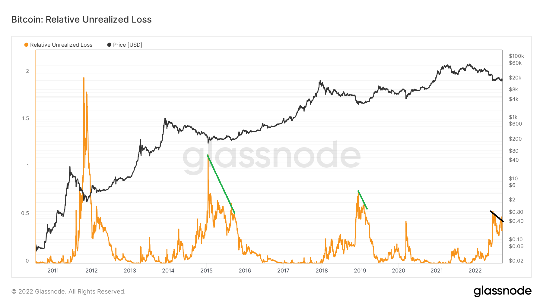 A Perda Não Realizada Relativa geralmente aumenta consideravelmente durante os fundos do mercado. Isso foi visível em 2015 com um valor de 1,14, em 2018 com um valor de 0,75 e em 2020 com um valor de 0,44. Valores tão altos são considerados sinais de capitulação.