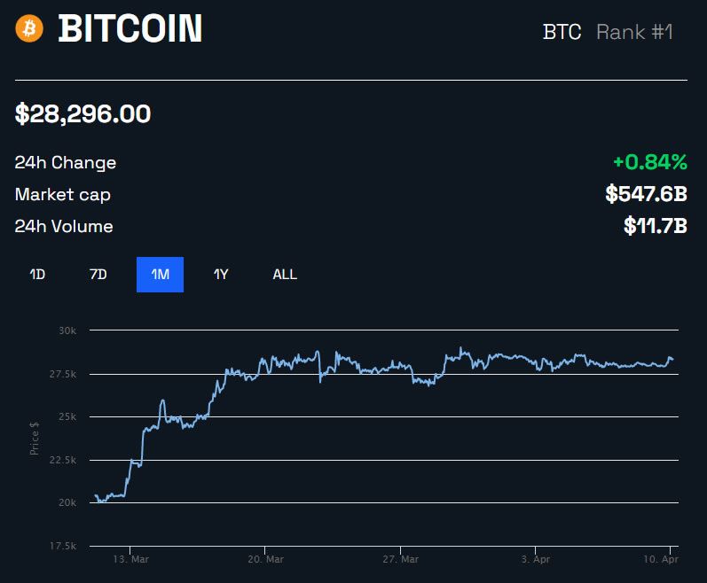 O BTC opera em alta nesta manhã de segunda-feira, atingindo o nível de US$ 28.500 – seu maior valor nos últimos cinco dias. No fechamento da matéria, seu preço tinha experimentado uma leve queda, sendo negociado em aproximadamente US$ 28.300.