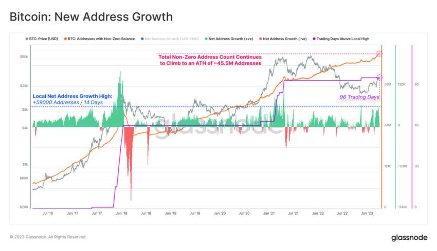No fim de semana, a Glassnode informou que o número de endereços não zerados foi impulsionado para um recorde histórico de 45,5 milhões. “Isso sugere que o grau de atividade on-chain está melhorando atualmente”, observou.