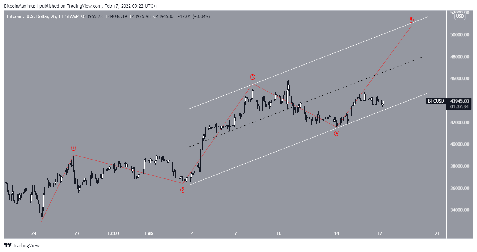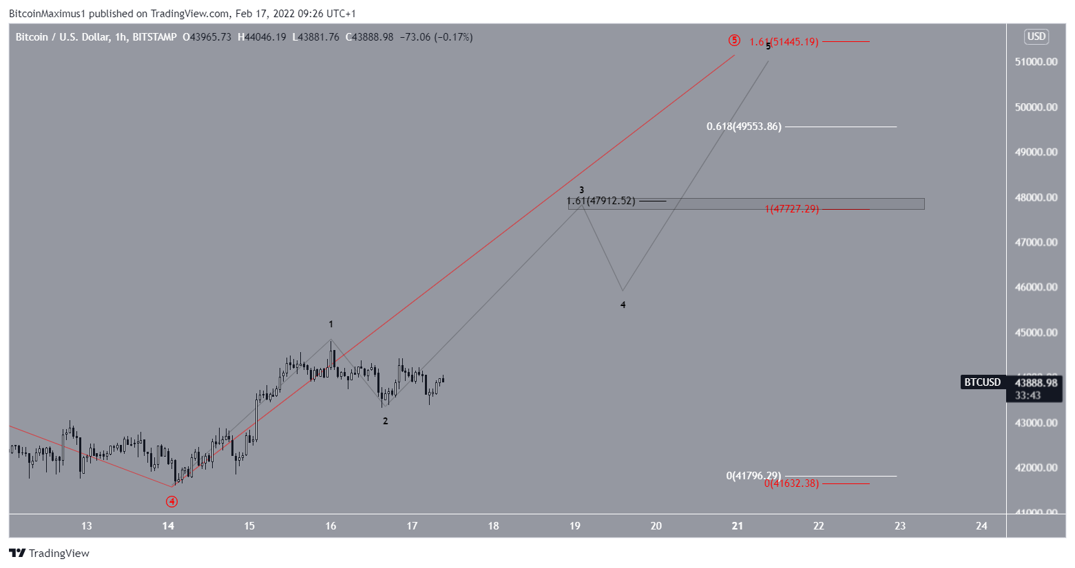 A contagem de ondas sugere que o Bitcoin está na onda cinco de um padrão de alta de cinco ondas (vermelho) que começou em 24 de janeiro. Como nem a onda um e nem a onda três se estenderam, faria sentido que a onda cinco o fizesse.