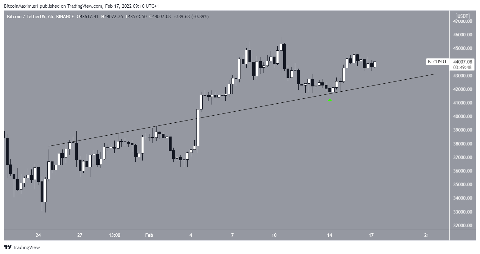 O gráfico de seis horas mostra que o Bitcoin rompeu acima de uma linha de tendência de alta e em 4 de fevereiro. Depois disso, seu preço voltou para validar a linha como suporte na última segunda-feira (ícone verde) e tem subido desde então.