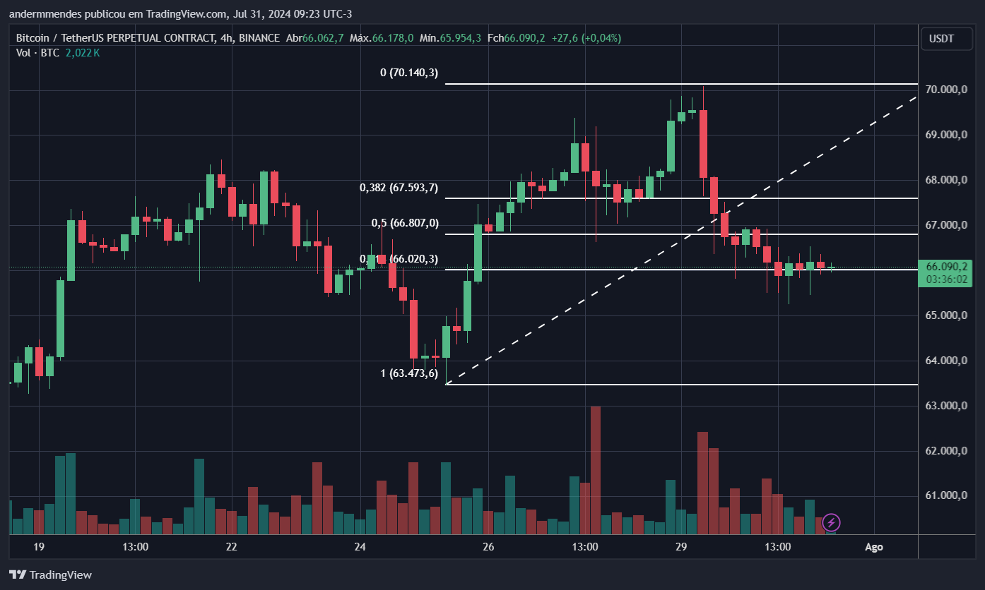 Apesar de operar em queda nas últimas 24 horas, o Bitcoin (BTC) conseguiu se manter acima de US$ 66.000. No entanto, nada garante que esse nível de suporte seja preservado.