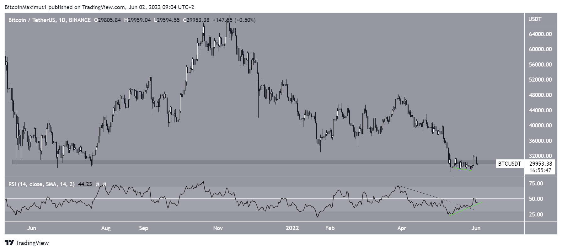 O BTC está em tendência de alta desde que atingiu uma mínima de US$ 26.700 em 12 de maio. Até agora, o movimento levou a um topo de de US$ 32.399 na última terça-feira (31).