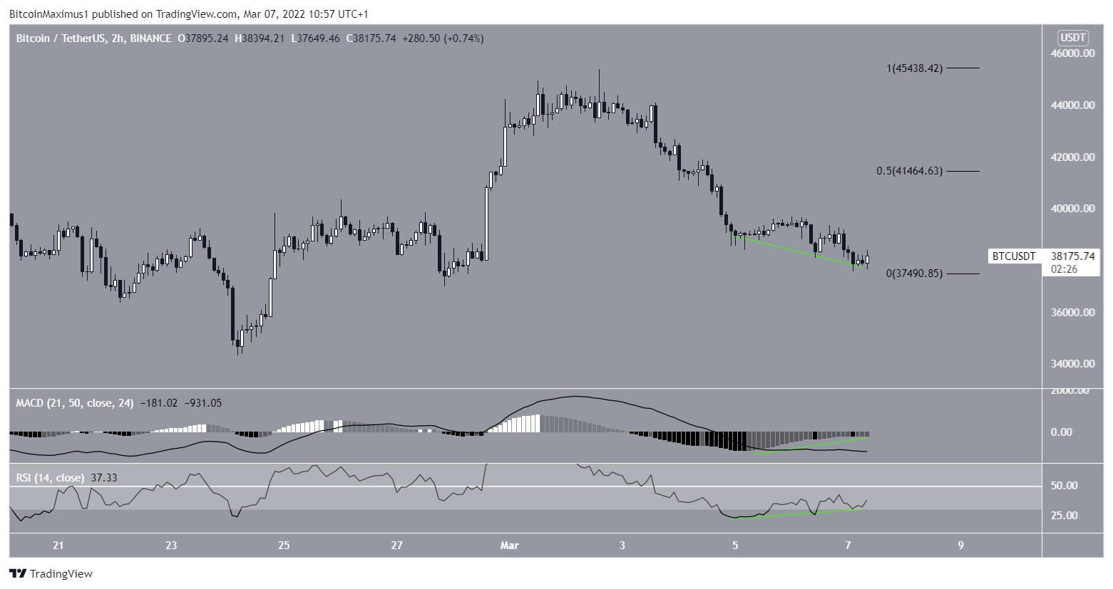 SponsoredNo entanto, o gráfico de duas horas sugere que um novo impulso de alta de curto prazo pode ocorrer antes de um rompimento. A razão para isso são as consideráveis divergências de alta que se desenvolveram tanto no RSI quanto no MACD (linhas verdes). Tais divergências geralmente precedem movimentos de alta.