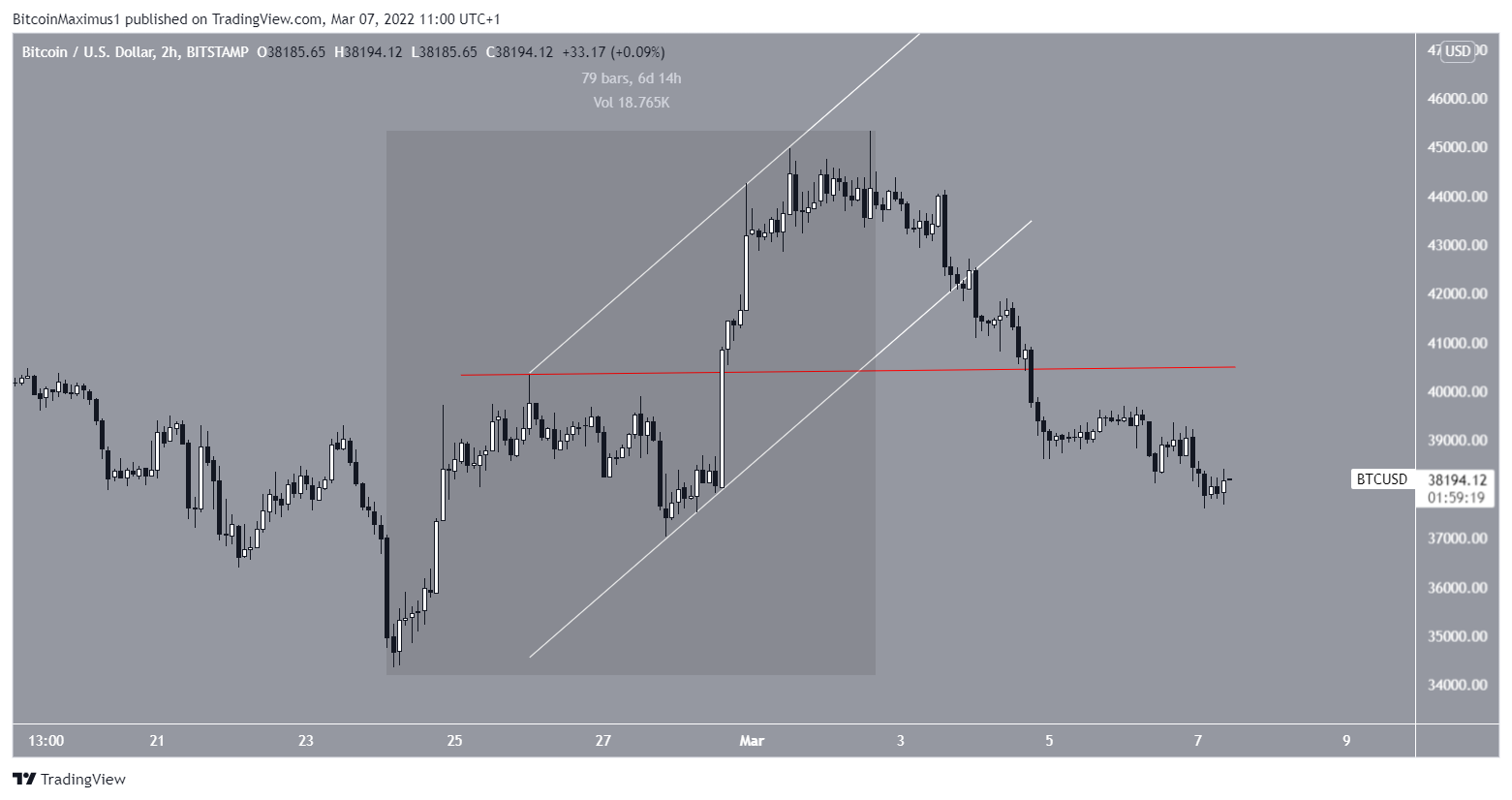 Inicialmente, parecia que o Bitcoin havia começado um movimento de alta de cinco ondas em 24 de janeiro. No entanto, na última quinta-feira (3), ele rompeu um canal paralelo de alta e caiu abaixo de suas máximas de 26 de fevereiro (linha vermelha) em US$ 40.330.