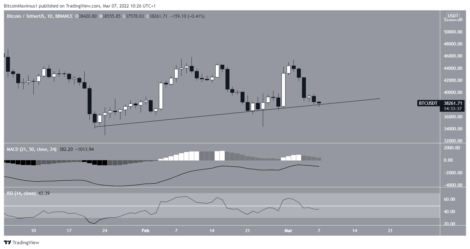 O gráfico diário mostra que o Bitcoin segue uma linha de tendência de alta desde 24 de janeiro. Recentemente, ele se recuperou na linha antes de retornar a ela nesta segunda-feira (7).