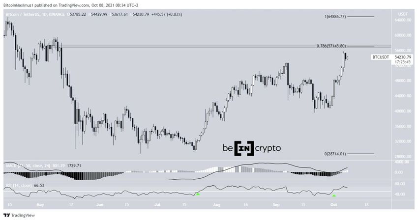 Ele está se aproximando rapidamente da área de resistência mais próxima de US$ 57.200. Este é um nível de resistência horizontal e Fibonacci, o que significa que é uma área de resistência muito forte devido à confluência. Um movimento acima abriria caminho para o preço mais alto de todos os tempos de US$ 64.640.