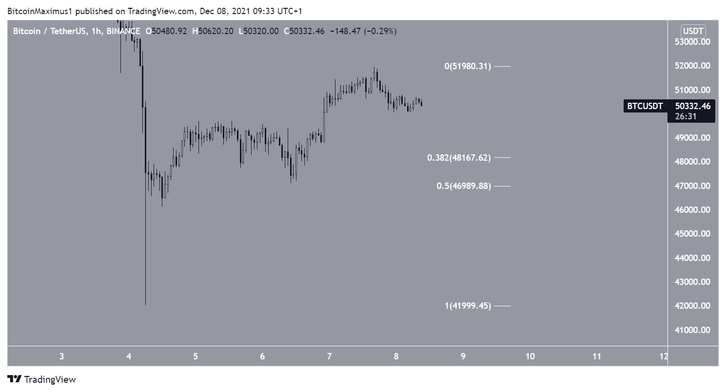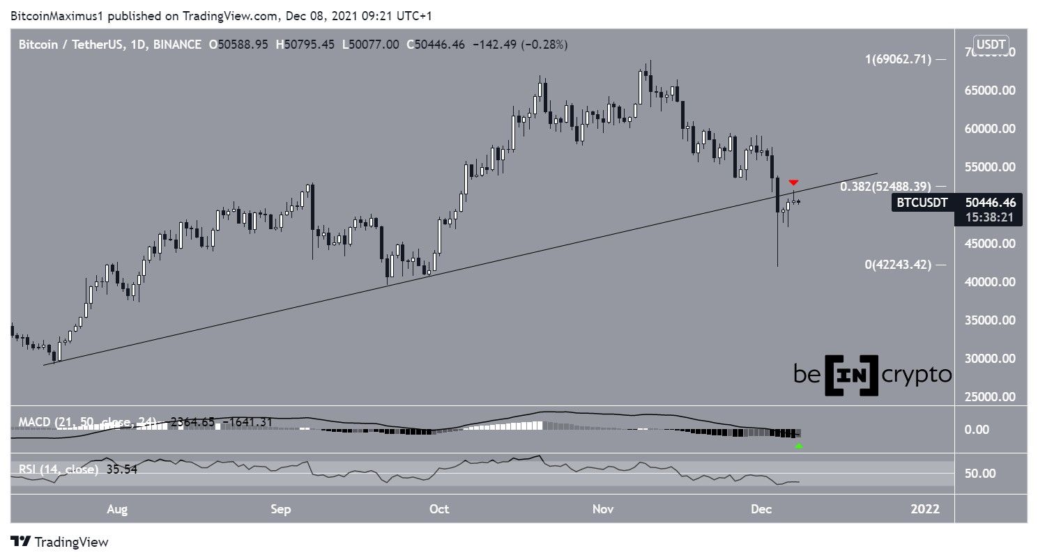 Na terça-feira (7), o Bitcoin atingiu uma alta de US$ 51.936 antes de voltar a cair. A alta serviu para validar a linha de tendência de alta anterior (ícone vermelho) como resistência. Além disso, a linha coincide com a área de resistência de US$ 52.500, criada pelo nível de retração de 0,382 de Fibonacci, aumentando ainda mais sua significância.