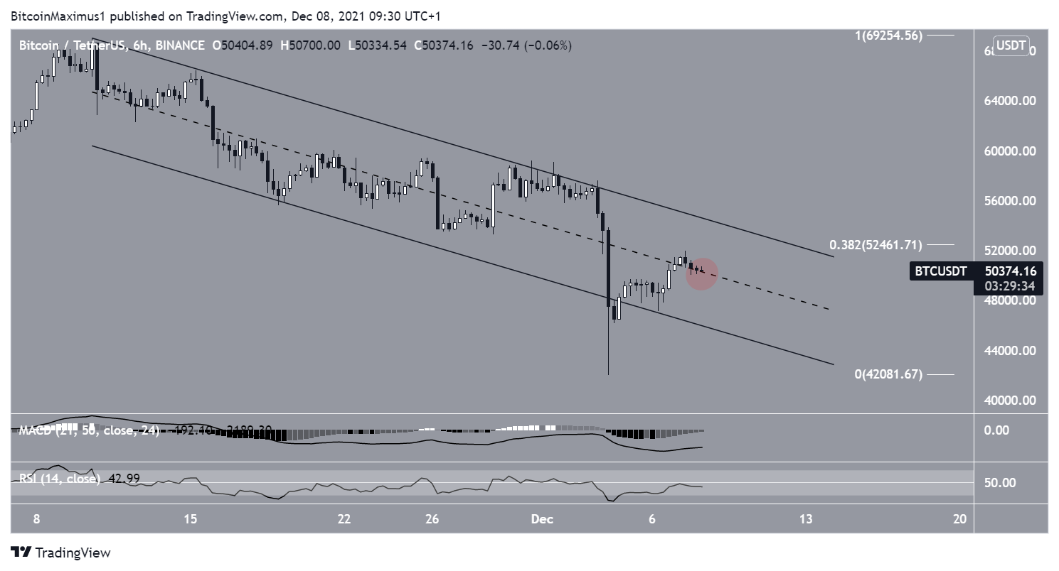 O gráfico de seis horas mostra que o Bitcoin está sendo negociado dentro de um canal paralelo de baixa desde 10 de novembro, depois de atingir a máxima histórica de US$ 69.000. Atualmente, o ativo está tentando recuperar a linha média do canal e validá-la como suporte (círculo vermelho).