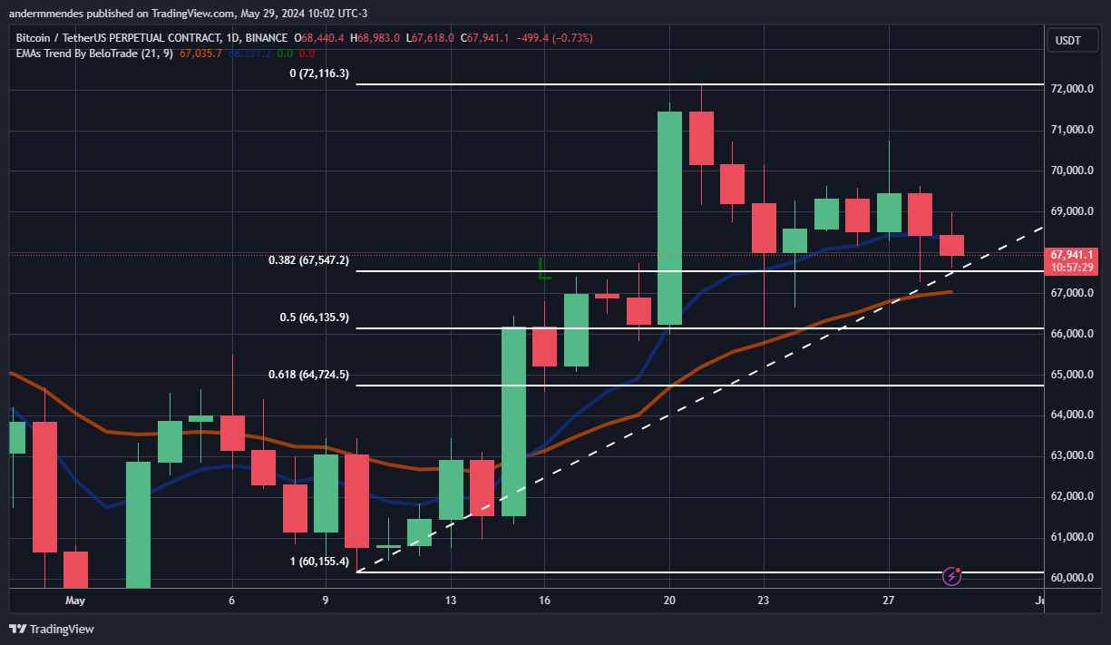 Dados do CoinGecko mostram que o BTC acumula uma queda de 0,7% nesta quarta-feira (29), negociado atualmente em US$ 67.880.