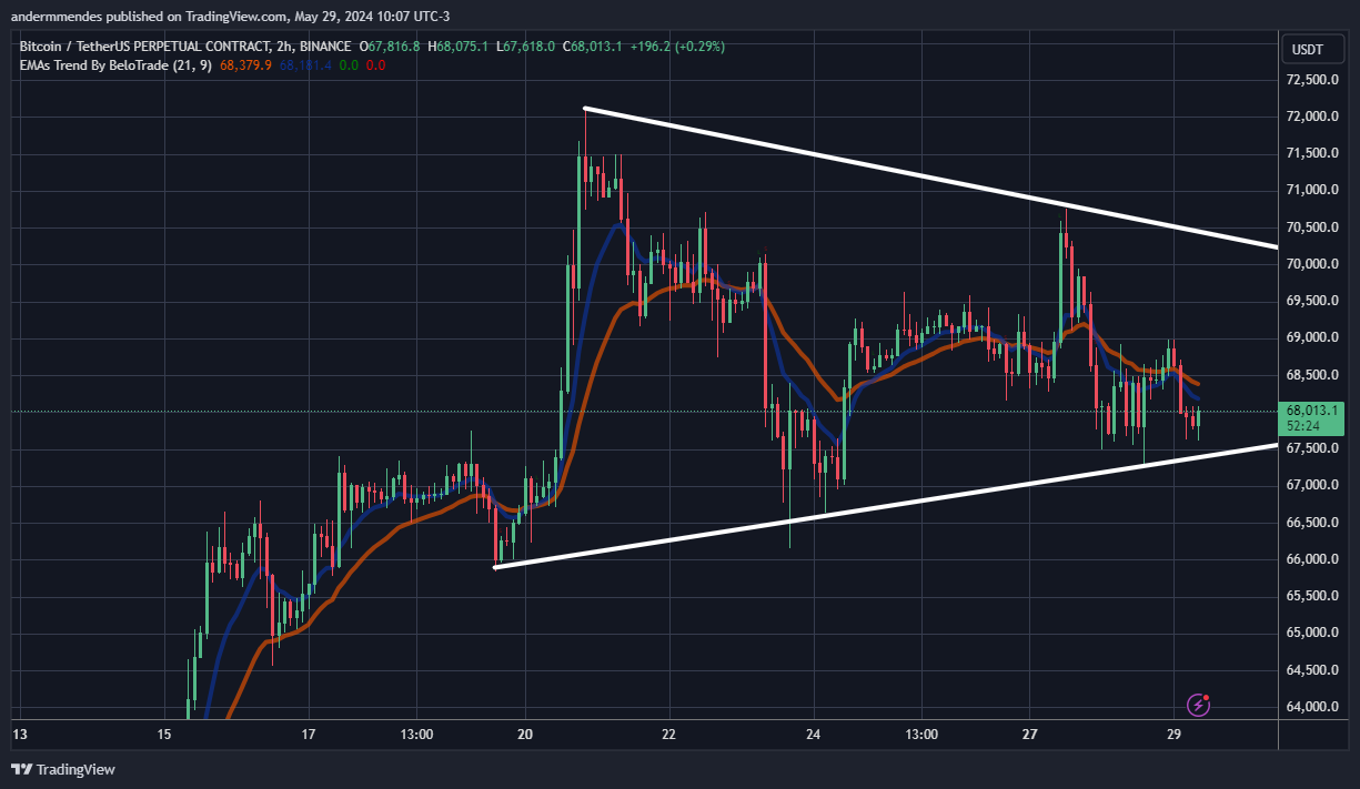 Se respeitar o padrão, o cenário mais provável é um novo salto em direção a resistência do triângulo, atualmente em US$ 70.300. No entanto, a EMA de 9 períodos está abaixo da EMA de 21 períodos, o que mostra que a tendência de curto prazo é de baixa.