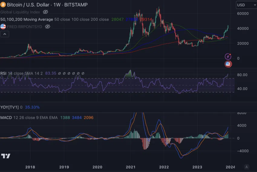 Apesar da resistência crescente, o Bitcoin não parece extremamente otimista, especialmente no gráfico semanal. O Índice de Força Relativa (RSI, linha roxa) está acima de 70 e o MACD (gráfico inferior) também parece otimista.