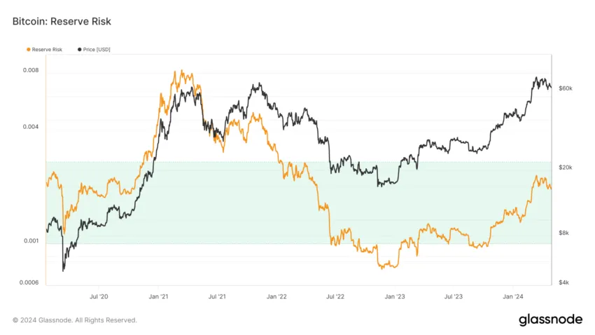 O indicador Reserve Risk está próximo de sair da zona verde ideal. Traders usam esse indicador para avaliar a confiança dos detentores de longo prazo em relação ao preço de um ativo. Portanto, quando a confiança é alta e o preço de um ativo é baixo, há um risco/recompensa atraente.