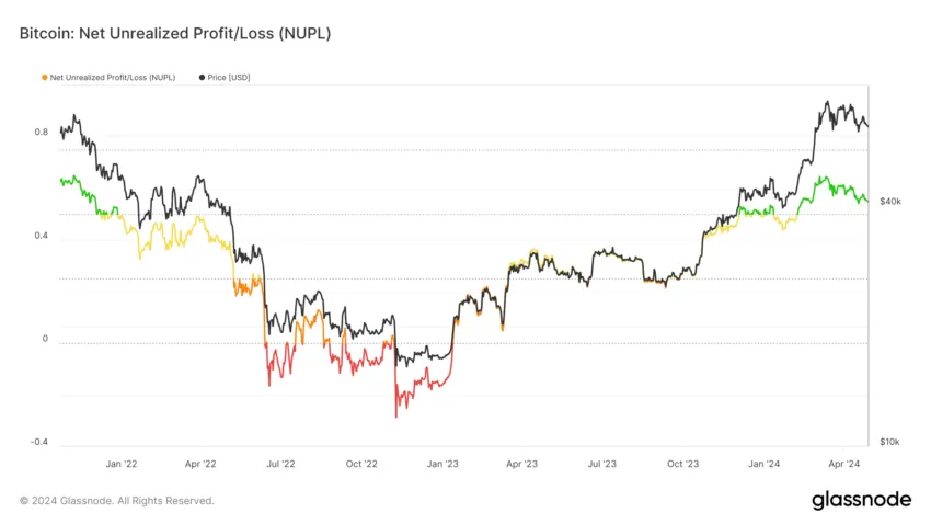 As mesmas indicações podem ser vistas no Net Unrealized Profit/Loss (NUPL). Esse indicador indica uma possível recuperação quando está na zona de Crença. Historicamente, o BTC cresceu no passado e até mesmo altas quando o indicador estava nessa zona, sugerindo o potencial para uma bull run.