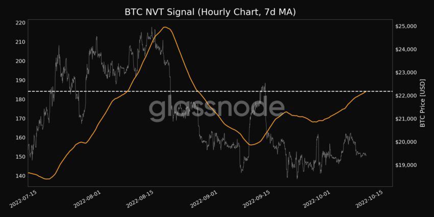 Com os detentores de longo prazo em prejuízo, a confiança do mercado dos detentores originais estava em risco. Além disso, o sinal Bitcoin Network Value to Transactions (NVT) (7d MA) atingiu uma alta de um mês de 184.148. Valores altos geralmente são indicativos de crescimento da capitalização de mercado superando o Volume de Transferência on-chain.