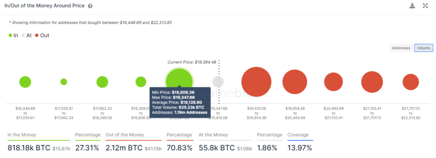 No entanto, uma olhada no indicador In/Out of the Money Around Price destacou que o nível de suporte mais significativo para o preço do Bitcoin estava no nível de preço de US$ 19.000, onde 1,19 milhão de endereços compraram mais de 625.000 BTC.