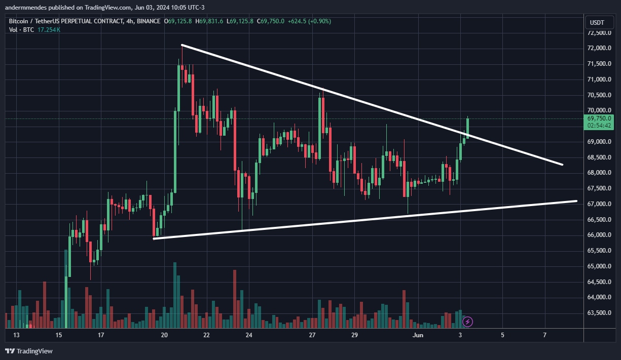 Por outro lado, se o Bitcoin seguir em alta, deve buscar o topo de US$ 70.480 e eventualmente chegar ao inicio da formação do triângulo, em US$ 72.050. Isso representaria um salto de 3,5% em relação ao preço atual.