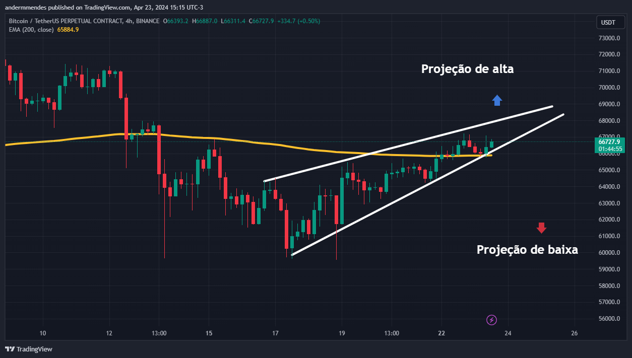 A cunha atual está se afunilando, com um rompimento, seja para cima ou para baixo, podendo ocorrer em breve. Caso o BTC perca a linha de suporte do padrão, e eventualmente o suporte da EMA de 200 períodos, seu preço tendo a cair para o nível de US$ 60.000 novamente.