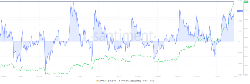 No caso do Bitcoin, o MVRV de 30 dias está atualmente em 16,26%, indicando que os investidores que compraram BTC no último mês estão obtendo um lucro médio de 16,26%. Esta situação leva frequentemente estes investidores a considerar a venda das suas participações para capitalizar os seus ganhos, o que pode levar a uma liquidação seguida de uma queda de preço.