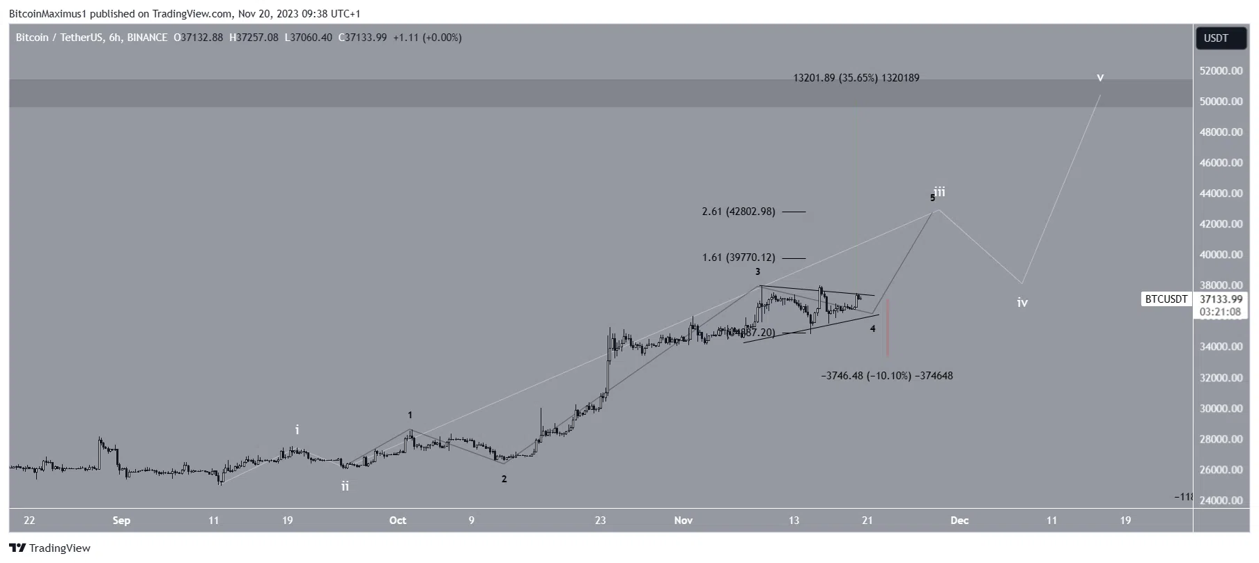 A contagem provável sugere que o BTC iniciou um movimento de cinco ondas (branco) em setembro. Nele, a onda três se estendeu.