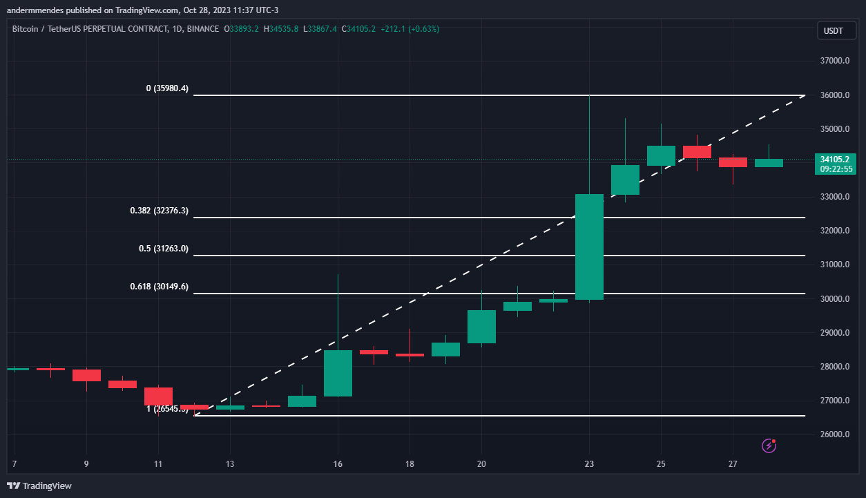 Ao utilizar a retração de Fibonacci, podemos ver que, caso o Bitcoin volte a cair, seu preço pode subir novamente ao atingir a faixa de US$ 31.260 – US$ 30.000.