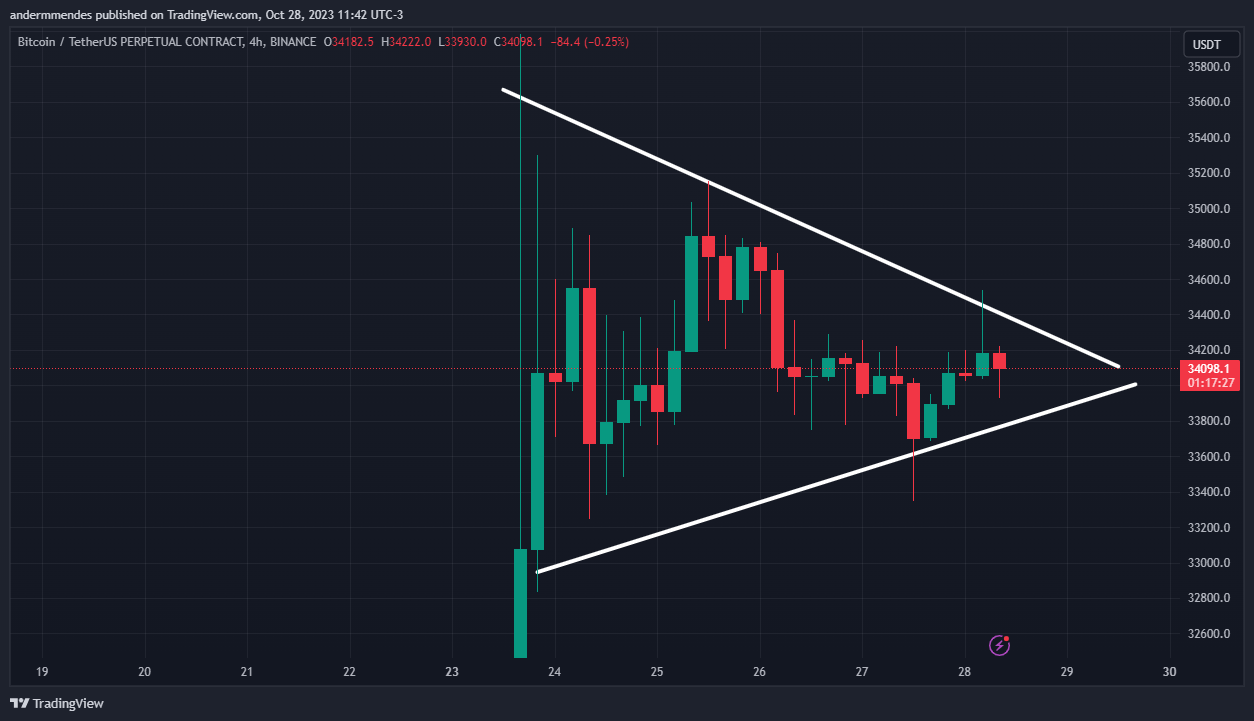 Pela tendência anterior ao padrão ser de alta, é provável que o preço busque superar a linha de resistência do triângulo. Caso isso aconteça, o Bitcoin pode subir para a próxima resistência em US$ 40.000.