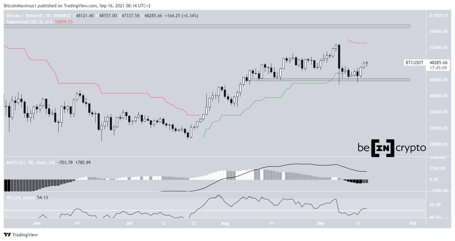 O BTC retomou sua tendência de alta após atingir a área de suporte de US$ 43.950 na segunda-feira (13). Durante os dois dias seguintes, ele criou dois candles de alta consecutivos.