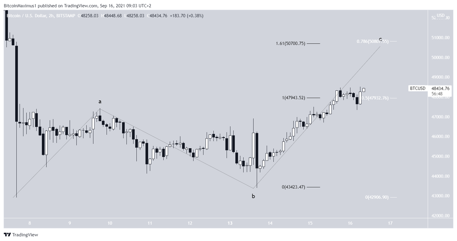 O ativo já se moveu acima do primeiro alvo para o topo da onda C em US$ 47.940. Esse foi o nível de retração de 0,5 de Fibonacci (branco) e a proporção de 1:1 das ondas A: C (preto).