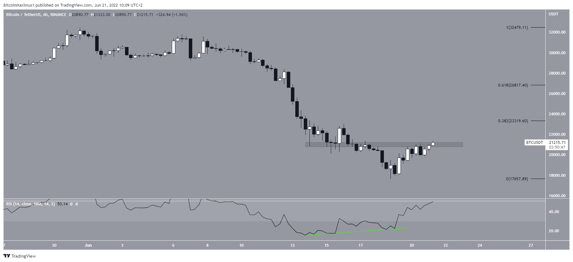 Atualmente, o preço está sendo negociado dentro da área de US$ 21.000, que anteriormente fornecia suporte e agora deve atuar como resistência. Caso isso aconteça, não haverá resistência até US$ 23.300, que é o nível de retração de 0,382 de Fibonacci descrito anteriormente.